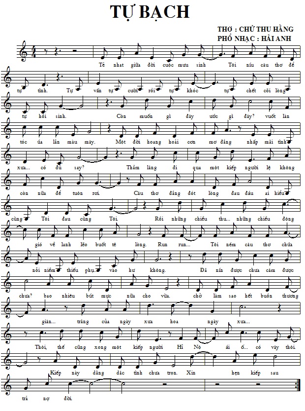 Các bản nhạc đăng TÁC PHẨM MỚI số 18. Hải Anh: Nghề chính của tôi là LƯƠNG Y. khám chữa bệnh đem lại sức khoẻ cho mọi người. Tôi luôn lấy: Niềm vui khỏi bệnh của bệnh nhân làm niềm vui của mình. Nỗi buồn mang bệnh của bệnh nhân làm nỗi buồn của mình. Và luôn coi sinh mệnh của bệnh nhân như người thân của mình. Và sau những thời gian căng thẳng nghiên cứu khám chữa bệnh đem lại sức khoẻ cho bệnh nhân của mình. Tôi thường thư giãn chơi ghi ta,vào các blog để đọc thơ và phổ nhạc cho những vần thơ hay, mong chắp cánh cho những bài thơ hay đó đến với đông đảo công chúng yêu thơ nhạc trong cả nước.