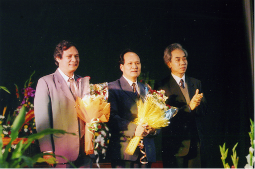 Lãnh đạo Trường ĐHBK Hà Nội chúc mừng GS.VS Đinh Văn Nhã (thứ 2, trái sang) và người em ruột- PGS.TS Đinh Văn Thuận đoạt Giải Thưởng Hồ Chí Minh về KHCN năm 2005