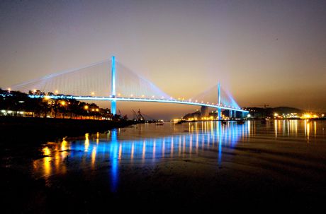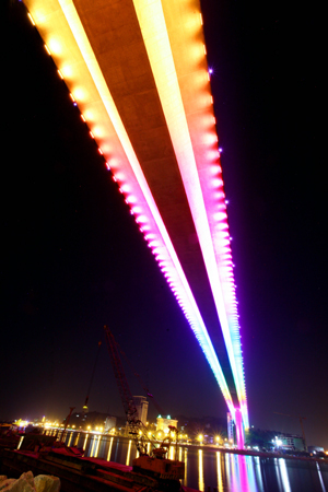 - Từ dưới gầm cầu nhìn ngược lên, những sợi dây văng trong ánh sáng lung linh, giống như những phím đàn Piano khổng lồ…