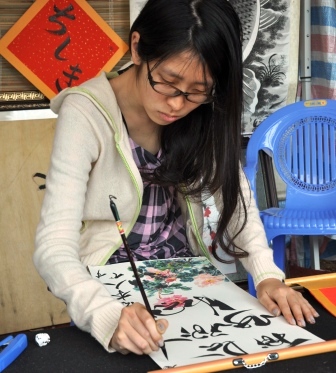 - Em học chuyên ngành Tiếng Việt ở trường Đại học OSAKA Nhật Bản. Hai năm trước em đã đi thực tế ở Việt Nam. Đợt này em mới sang. Tranh thủ viết Thư pháp là cách vừa đi học vừa đi làm.