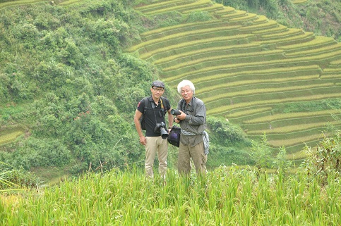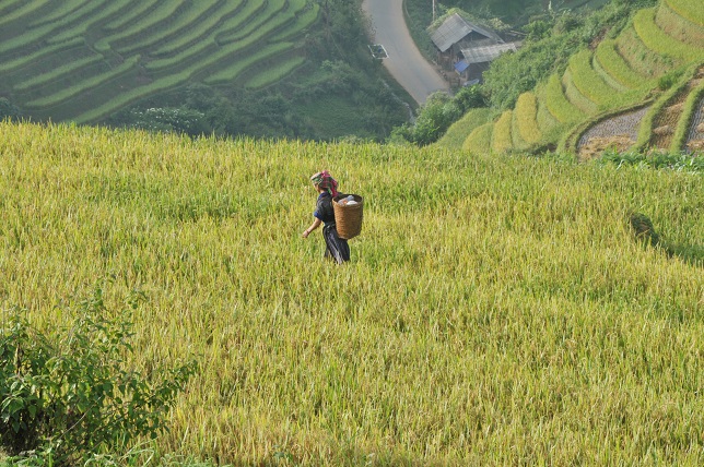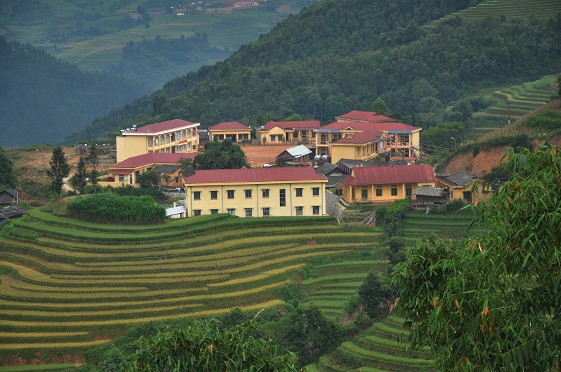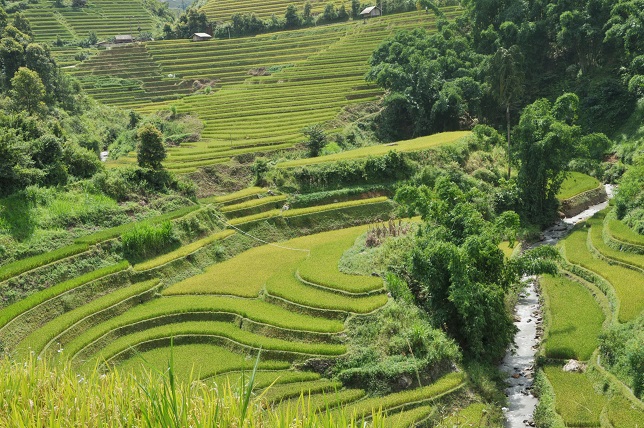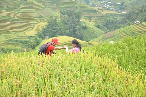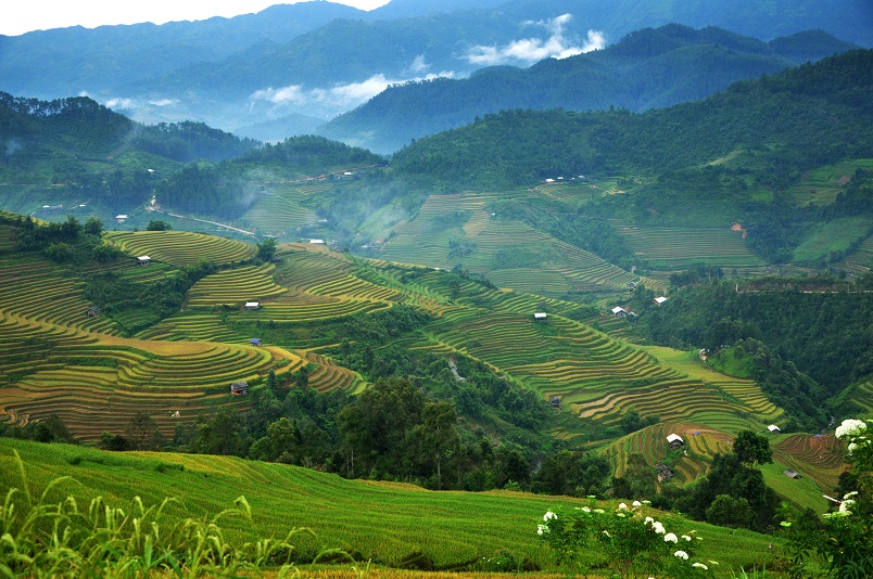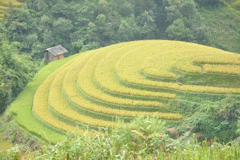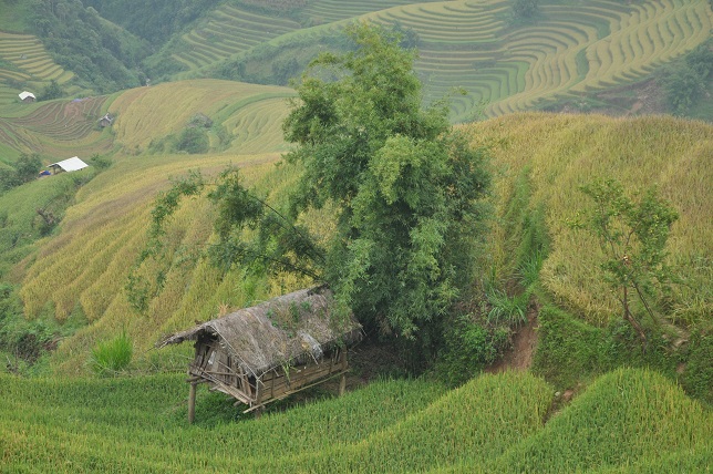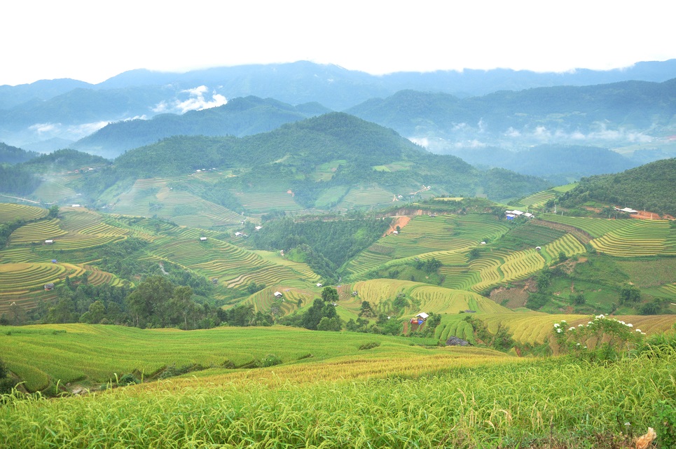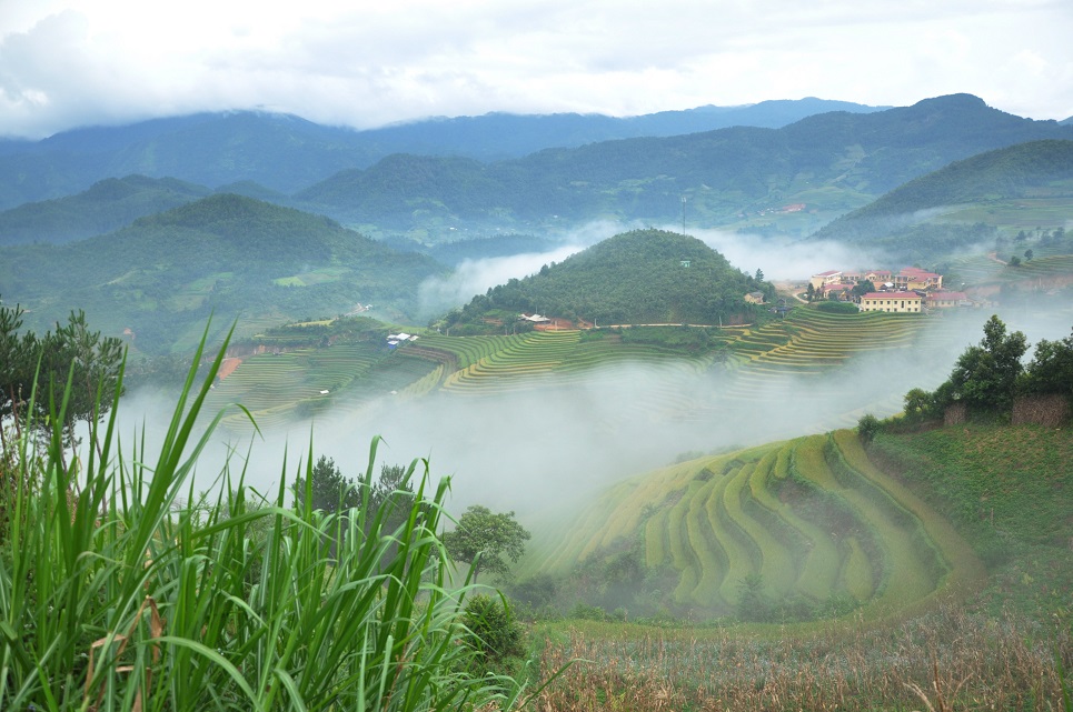 Buổi sáng, rời khỏi Ngã Ba Kim, một phố núi nho nhỏ xinh xinh, chúng tôi đi về phía xã La Pán Tẩn, nơi nổi tiếng về những thửa ruộng bậc thang đẹp nhất Việt Nam. Đến lưng chừng đèo chúng tôi dừng xe và không thể không reo lên khi ngắm những đám mây nhẹ xốp như bông luồn lách giữa những khe núi. Phải bấm máy thật nhanh bởi phong cảnh nên thơ ấy sẽ thay đổi từng tích tắc. Chỉ trong một vài phút, tất cả những ngọn núi và những mái nhà sàn rải rác trong thung lũng đã chìm trong mây trắng... Rồi nắng lên, mây tan dần, nắng trải vàng trên đồng lúa, nắng sưởi ấm những nếp nhà khiêm nhường ven rẫy. Nắng rọi chiếu trên sườn núi tạo nên những bức tường thành kiên cố của thiên nhiên vây quanh thung lũng lúa. Xa xa, trên đỉnh một ngọn đồi, mái trường với màu ngói đỏ tươi trong nắng tạo nên điểm nhấn đáng yêu trong bức tranh hữu tình có một không hai ấy. Nắng và gió biến những thửa ruộng bậc thang thành biển lúa với những con sóng xanh, sóng vàng nhấp nhô ngút tầm mắt. Và lòng chợt rưng rưng cảm động khi chợt nhận ra bóng áo chàm đơn chiếc trên biển lúa mông mênh...