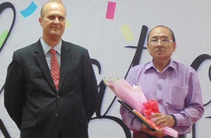 GS - TS Juergen Mallon, Hiệu trưởng trường ĐH Việt - Đức trao bằng tốt nghiệp ĐH danh dự cho bác Trần Hữu Khoa, khi bác lên nhận thay cho con trai Trần Bảo Duy