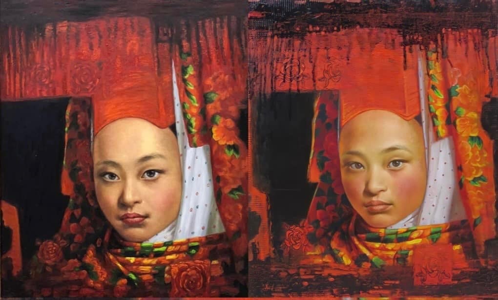 Bức tranh có tên “Cô gái Dao đỏ” của hoạ sĩ Lê Thế Anh (trái) và tranh chép lại (phải) được Lê Thế Anh ký tên. Ảnh: NVCC