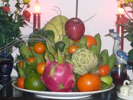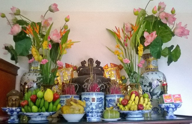 Lau dọn nhà cửa, bàn thờ xong thì Tết đã cận kề. Trên bàn thờ nhà tôi, ngoài bộ đồ đồng ra, thì còn hai lọ lục bình bằng sứ khá to và đẹp. Chúng cao khoảng hơn nửa mét. Thân bình màu trắng, có vẽ hai con hươu đứng dưới những cành tùng màu xanh. Hai lọ lục bình này, ông anh cả của tôi cắm hai cành đào phai, chặt ngoài vườn hoặc đi xin ở đâu đó. Bát hương to bằng sứ đặt đúng giữa bàn thờ. Thày tôi nhổ bớt chân hương, hót bớt lớp tàn nhang và cát phía trên, đổ thêm vô đó một lớp cát trắng mới, rồi lau sạch xung quanh bát hương và bàn thờ. Công việc này, tôi để ý thấy Thày tôi làm, với những động tác hết sức cẩn trọng, và với vẻ mặt vô cùng thành kính. Ngoài cùng, ngay sát bát hương là cái mâm bồng khá to, được tiện bằng gỗ mít vàng. Cái mâm bồng này, có chân cao khoảng mười phân, mặt có đường kính khoảng hơn ba mươi phân. Thày tôi bày lên đó hai nải chuối xanh, quây tròn như một bông sen nở. Chính giữa bông sen xanh ấy, đặt một quả Phật thủ thật to. Xung quanh quả Phật thủ là quýt đỏ, cam vàng, hồng… Thầy tôi dặn là phải bầy mâm ngũ quả sao cho thật đẹp và xum xuê, thì năm mới sẽ ăn nên làm ra. Cuối cùng là treo hai câu đối đỏ lên hai cái cột hai bên bàn thờ.