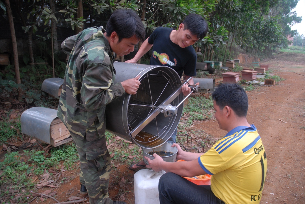 Với tinh thần vượt khó không cam chịu cảnh nghèo khó, anh Việt đã tìm hiểu và quyết định nuôi và phát triển đàn ong lấy mật. Vì không có vốn lớn nên anh chỉ dám nuôi những đàn ong nội (gọi là ong ta) chưa dám mua nuôi ong nhập ngoại. Ngày đầu chỉ với một hai đàn ong nhà, anh đã nghiên cứu học hỏi kinh nghiệm của bạn bè và xuống Hà Nội học ở Hội nuôi ong Việt Nam, những bậc cao niên và bạn bè đã tận tình chỉ bảo và hướng dẫn. Về quê với những điều kiện thuận lợi là nhà ở gần rừng nên anh đã phát triển ra được hàng trăm đàn (gọi là thùng ong). Anh Việt tâm sự “ Nuôi ong từ lúc bắt đầu cũng khó lắm, có những năm thời tiết không thuận lợi, gây nên bệnh tật cho đàn ong, chúng chết gần hết, gia tài gần như mất trắng, chỉ còn lại 3 đến 4 thùng ong. Song tôi vẫn cố gắng tìm tòi phương pháp bảo vệ và chữa bệnh cho đàn ong, đến nay tôi đã gắn bó với nghề này được 8 năm, và hiện nay tôi đã có 160 thùng ong.Thu nhập thì chỉ cao hơn nhà nông một chút, nếu năm nào thuận lợi về mọi mặt thì có lợi nhuận được trên 100 triệu đồng. Mỗi năm thu 12 lần, kết hợp với việc trồng và chăm sóc rừng Quốc gia thì cuộc sống gia đình 2 vợ chồng và 2 con ổn định”. Tôi đến thăm các thùng ong của anh di chuyển và đang đặt trên khu vực Hòa Lạc, dưới những tán cây vải, nhãn, xoài, keo và nhiều cây khác đang vào mùa hoa nở rộ, vào thời điểm này ong lấy được nhiều phấn hoa về làm mật, anh Việt cùng nhóm bạn mang dụng cụ đến để quay ly tâm lấy mật ong ra thùng. Một nhóm có 4 người, khi chuẩn bị lấy đõ ong ra khỏi thùng, họ đốt và phun một loại khói xịt vào quanh tổ, người mở thùng và lấy đõ ong phải mặc bộ quần áo và mũ lưới chuyên dùng che kín hết người và tay chân để không bị ong đốt. Đõ ong lấy ra được đưa và thùng quay ly tâm để mật văng ra, sau đó lại để trả tầng ong đã lấy hết mật đưa lại vào thùng cho ong làm tiếp mật. Cứ như vậy chỉ trong vòng 2 tiếng đồng hồ các anh đã lấy mật của gần 100 thùng ong. Mật tươi được lọc tại chỗ và bán ngay cho những người đã hẹn trước chờ sẵn ở đó. Vì làm chưa được nhiều nên anh Việt chưa có thị trường lớn, giá bán tại chỗ là 180.000 đồng một lít. Nhìn thùng mật ong vàng sóng sánh với mùi vị hơi hăng hắc của phấn như hoa keo, hoa vải, hoa nhãn, cam, bưởi ...ai cũng thích và muốn nếm thử thứ sản phẩm thứ thiệt không pha tạp của núi rừng đã được cộng với mồ hôi, công sức của những thanh niên không cam chịu nghèo khó. Tất cả đã tạo nên một thứ mật ngọt dâng cho đời. Như vậy chả thấy thật đáng yêu quý và trân trọng lắm sao!!!
